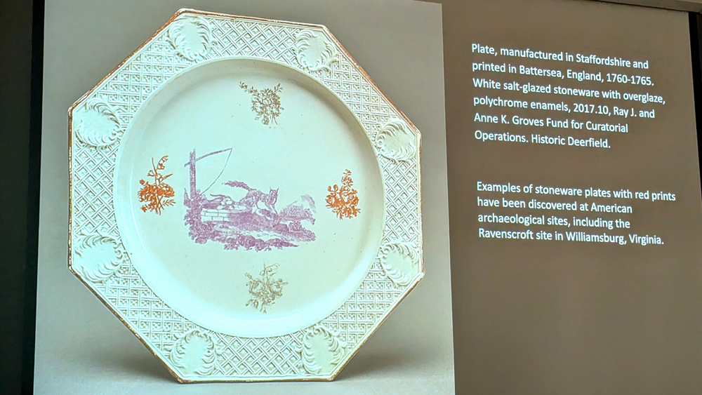 After lunch we moved to the museum’s Flint Center, a contemporary building housing exhibits, archives, and collections storage for “Transferware Treasures at Historic Deerfield.” Amanda and Dan had selected a number of interesting transferware pieces from the collection for us to see and discuss in the lecture hall – many of them seen earlier in the two presentations. For the remainder of the afternoon we spread out to tour the museum’s exhibits, collections, and historic houses.