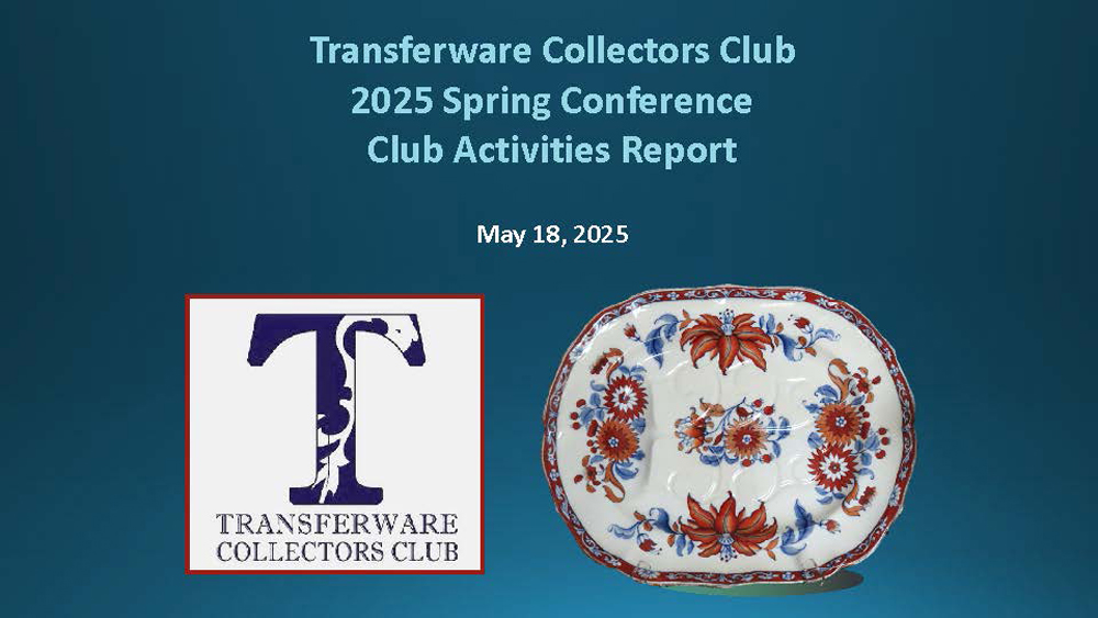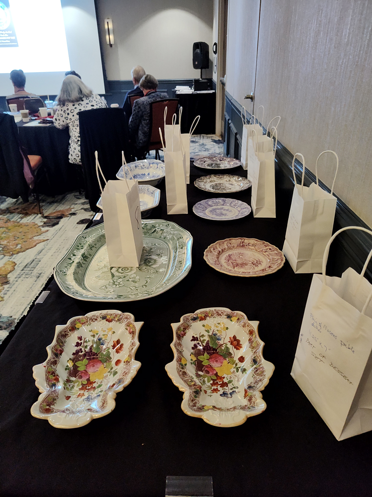 Wrapping up the conference, President Scott Hanson provided an update on club activities with help from several committee chair board members and Past-President Loren Zeller unveiled plans for the TCC to return to England for the 2026 Spring Conference. Nancy Parks and Sara Brydges sold the final raffle tickets and the lucky Raffle Winners were drawn before the annual Transferware Sale. Dealers Karen Beare, Leslie Bouterie, Joy Hanes, and Dennis Rolander had a large and varied selection of pieces available for sale and many attendees found treasures to take home. Thanks to Heather Cline for organizing the sale!