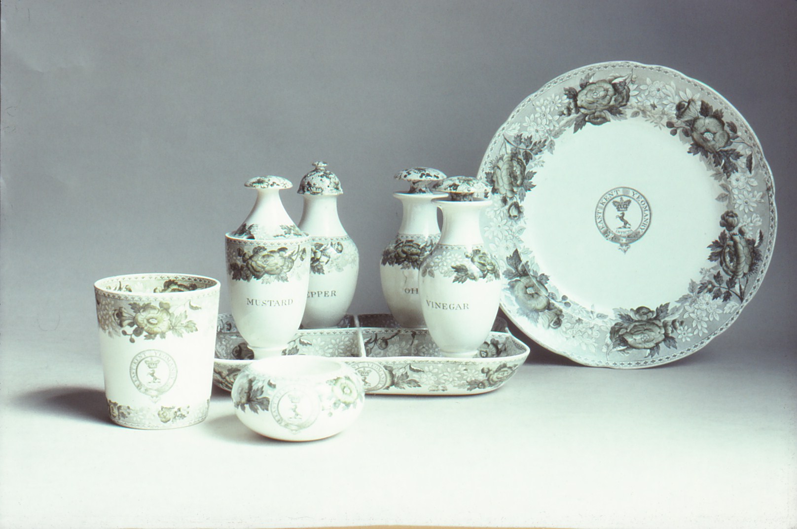 Cruet on tray, East Kent Yeomanry, Blue Rose, c.1827 Cruet=oil and vinegar; Condiment set= salt, pepper and mustard