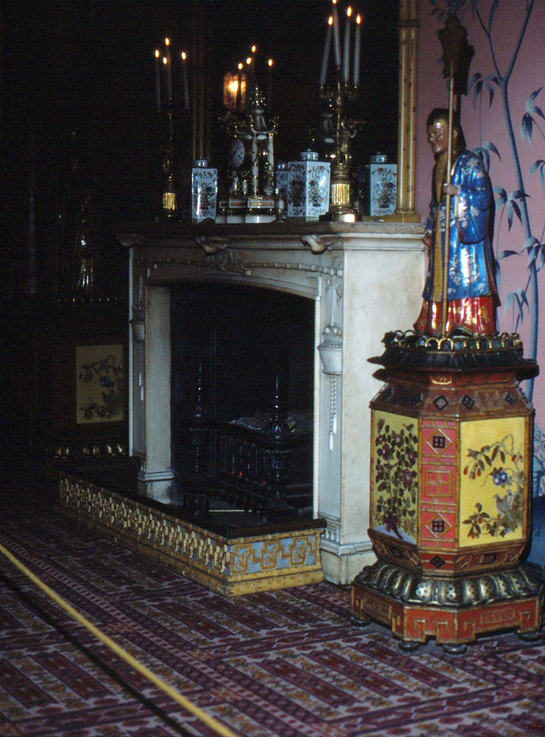 Fireplace in corridor, courtiers on pedestals