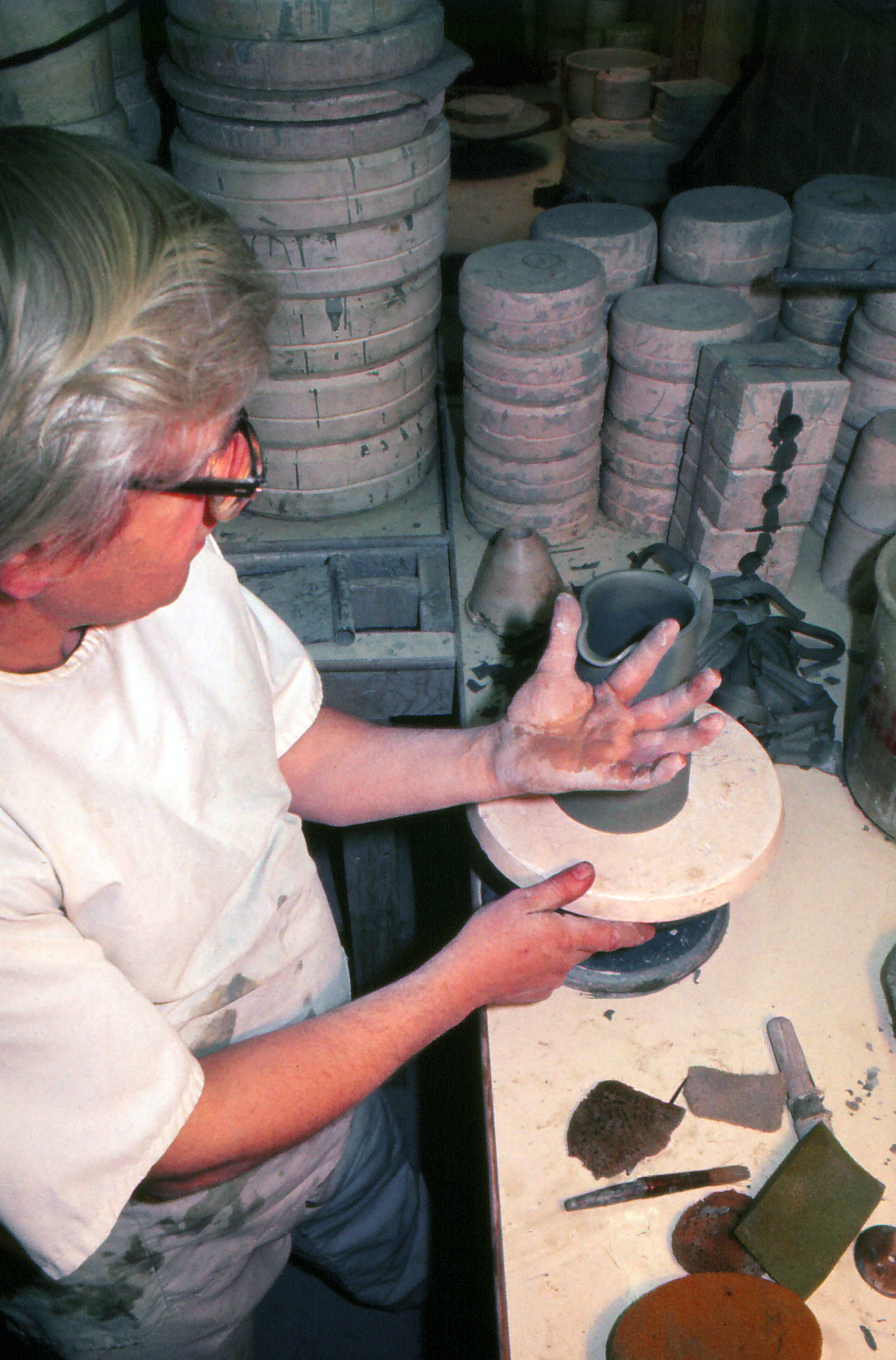 Making a Lowestoft milk jug-fingers held beneath snip to support soft clay