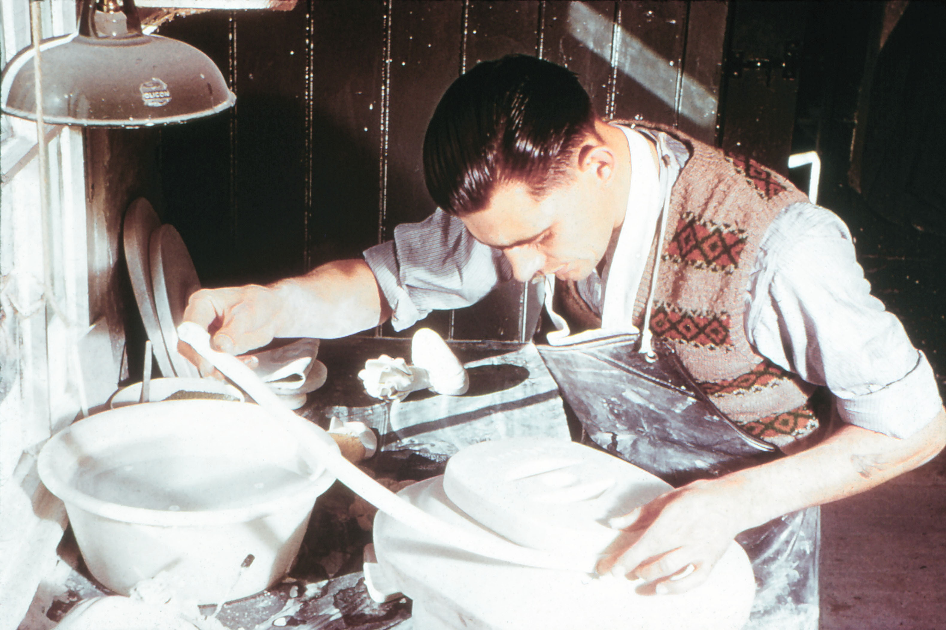 With the 'footer mould' in place, Ken feeds the long length of the clay to form the foot, pressing the clay to the mould with his middle finger