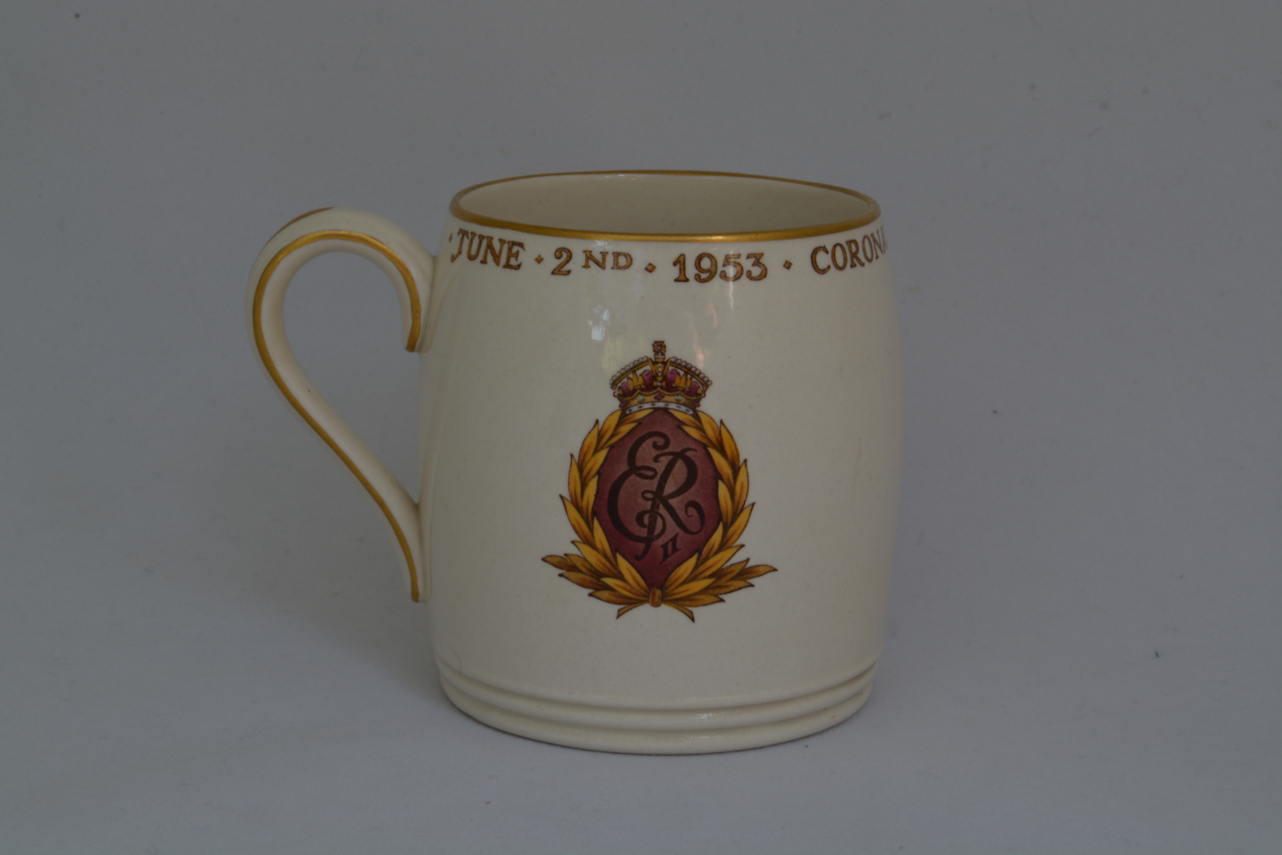 Reverse of Queen Elizabeth coronation mug 1953, specially commissioned to be given to all her estate workers