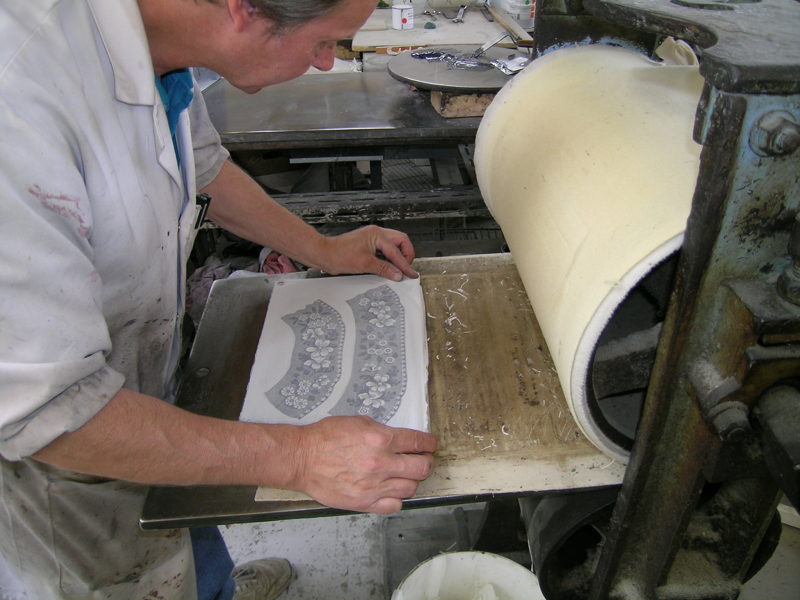 Chris Gibb removing the border tissue, last day of Spode printing