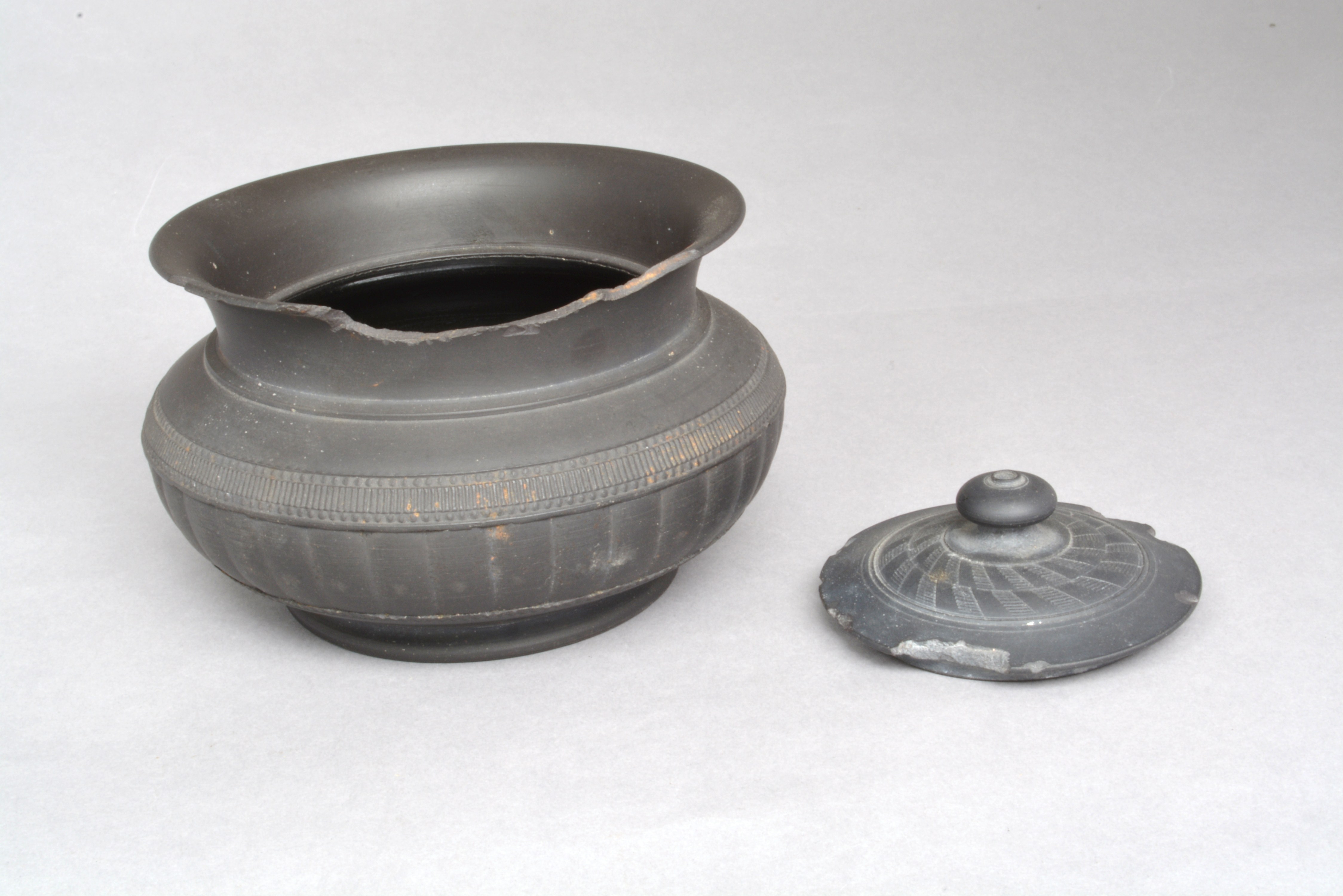 Basalt sugar bowl found on Spode works site in 1950 during the rebuilding of the Black Bank site