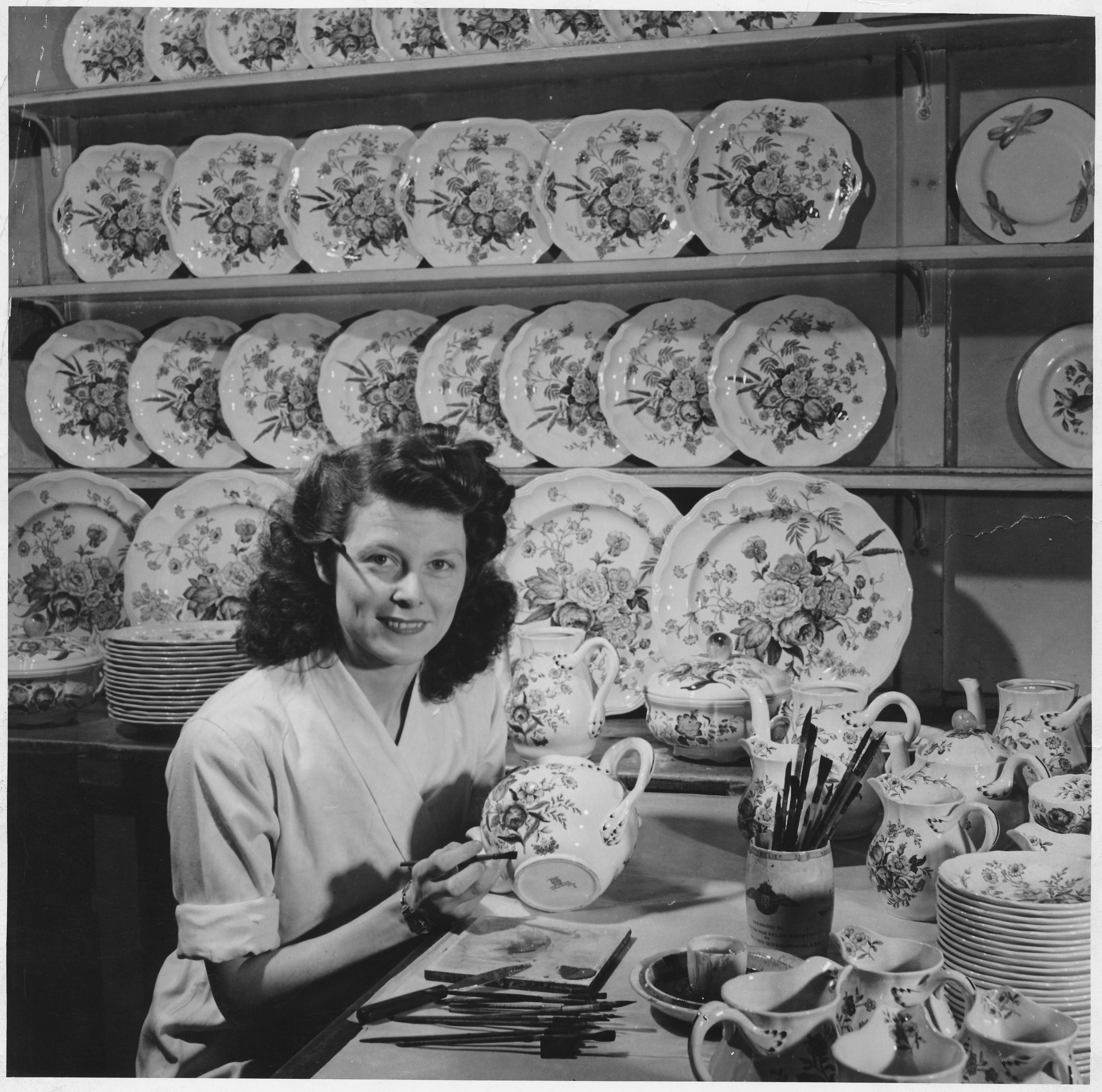 Jane Dennis painting Gainsborough pattern. Potteries poster girl in early 1940's