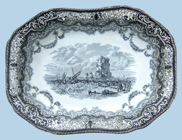 The “Continental Views” series is a little more difficult in that the scenes are not individually titled. Again I have records of seventeen different scenes and with a great deal of work I have managed so far to identify seven of them. They are found on dinner and toilet wares printed in blue, black or brown. Examples seem to show up even less than the Arabesque series and I have decent images of a paltry three of them. The example shown here is a view near Lisbon on a baking dish.