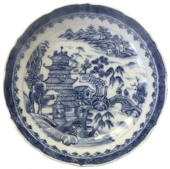 | Willow Nankin Saucer, 5 inches. A Caughley (1775-1779) porcelain Willow Nankin pattern that is copied almost exactly from the Chinese original, which is known as Two Birds. To learn more about this early Willow pattern, see Willow Nankin in the database. |