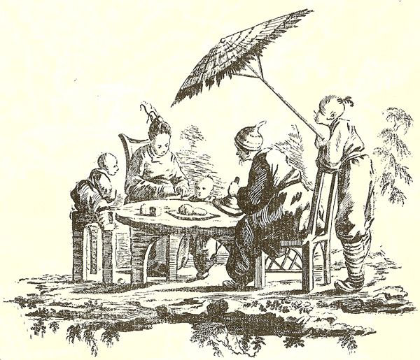 "Chinese Market Stall." Maker Unknown. This pattern is shown on a pearlware well and tree platter measuring 13 5/8” by 18 1/4” and is printed in underglaze blue with overglaze clobbering in shades of rust red and ochre enameling on the edge. The added coloring is unusual on a pattern of this type. Found on the back is an impressed “18” mark indicating the size of the dish and a blue hand painted “X” printer's mark. The border incorporates geometric shapes and picture medallions. Examples are known both with and without the name 'Wear Sc.' at the end of a fence in the design. [Not present on this piece.] The pattern is frequently attributed to Andrew Stevenson of Cobridge, Staffordshire, on the grounds of its resemblance to other marked similar patterns. This pattern can be found the TCC Pattern and Source Print Database. |