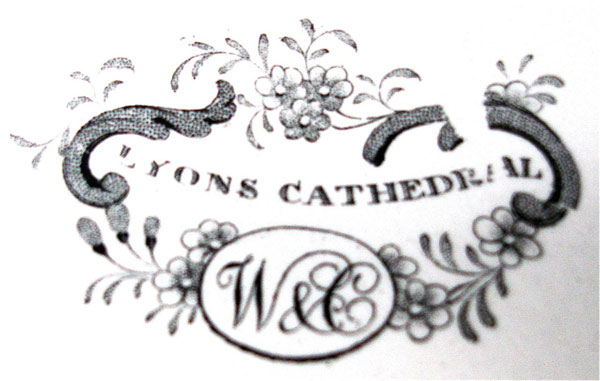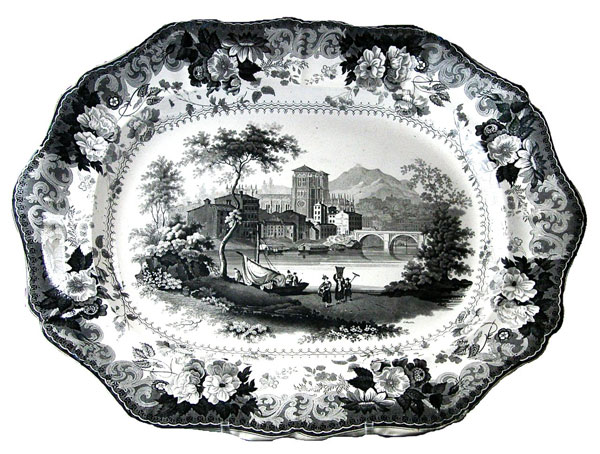 "Lyons Cathedral" , printed on a 18.5 inch by 15 inch platter, is part of the Continental Views Series. Each size and shape has a different center. It was made by Wood & Challinor (1828-1843) around the end of their production. The series was printed in many colors. To learn more, please visit our Pattern and Source Print Database.