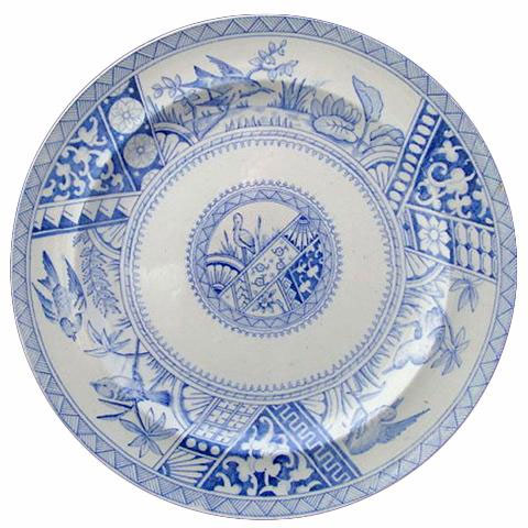 Seen here is a 10.5 inch plate printed in the "Congo" pattern by Forester & Hulme (1887-1892). It is common for an Aesthetic pattern to have a place name as the title, although the birds and plants here seem to have little to do with the Congo. Members only: for more information about this pattern and to see other similar patterns, search the Pattern and Source Print Database.