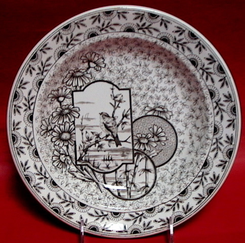 Seen here is a 9.75 inch plate printed in black and red in the Ayam-Jantan pattern made by J & M P Bell & Co. (1842-1928) in Glasgow Scotland. The Rd. Number, 17429, is circa 1891. The pattern has a non-English descriptive title as it was intended for the South East Asia market. Visit more information and other archived patterns to learn more about this pattern.