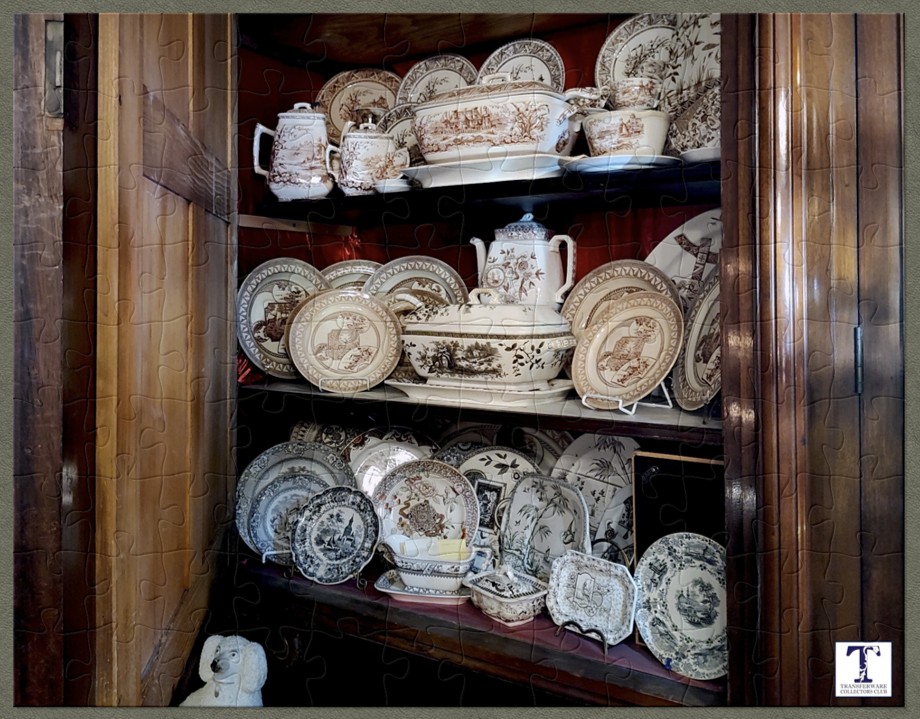 This cabinet filled with a wide variety of Aesthetic Movement transferware patterns in brown and black is located in a San Francisco house of the Victorian era – decorated in the Aesthetic style. The Aesthetic Movement in Britain (c. 1860 – c. 1900) aimed to transform the ugliness and materialism of the Industrial Age by focusing instead on producing art that was beautiful without needing a deeper meaning, Art for Art's sake. Items of Japanese origin or inspiration took pride of place. Japan's forced opening to foreign trade in 1853 triggered a veneration of all things Japanese, exemplified by England's passion for old 'Blue-and-White' Asian ceramics. Japanese design concepts such as asymmetry, flat patterning, simplified form and elegant surface ornament became foundational to the Aesthetic vocabulary. Scott Hanson photo.