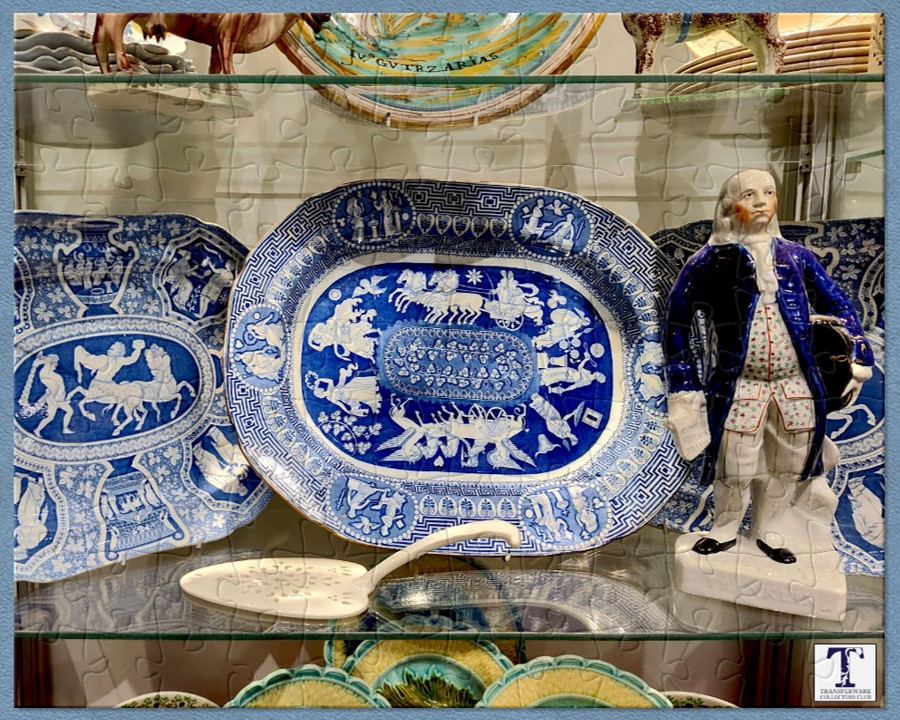 These transferware platters and Benjamin Franklin Staffordshire figure were seen at the Philadelphia Antiques Show during the recent TCC Annual Meeting. The platters at left and right are known as Greek #11 (TCC Database #4913), part of a series of more than 30 related center images using the same border that was introduced by Spode around 1805. The center platter is from the “Greek Pattern” (TCC Database #10731) made by an unidentified Staffordshire pottery. The center images of both patterns are based on late 18th century published sources illustrating Greek gods and myths. Dr. Franklin was Philadelphia’s most famous citizen in America and Europe during his lifetime and long after. It is not known which Staffordshire pottery produced this version of the Franklin figure in the mid-19th century.