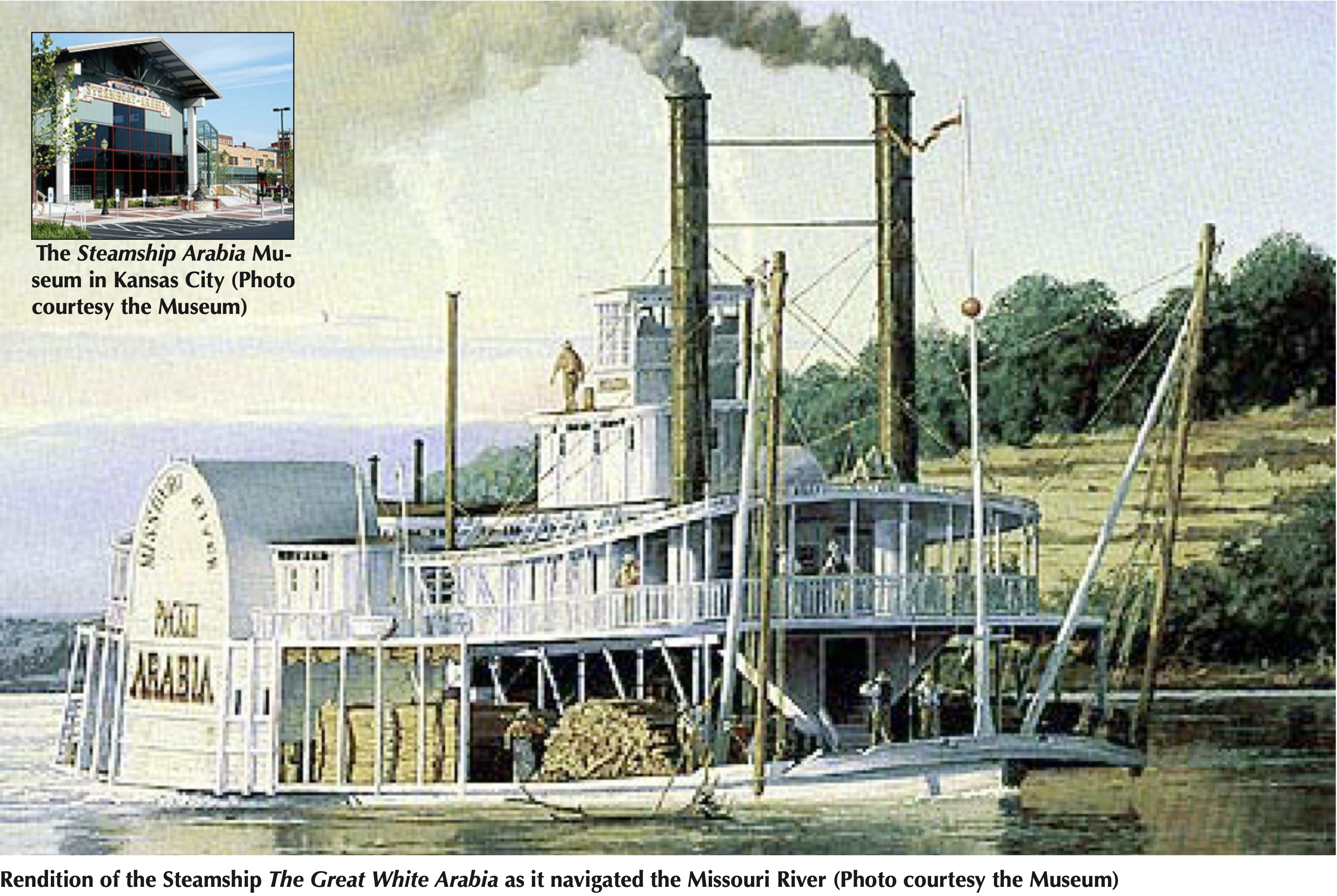 The Great White Arabia was a 171-foot steamer built in 1853 in Pennsylvania. It eventually wound up doing business on the treacherous Mississippi and Missouri Rivers. In St. Louis in 1856, she was headed upstream for the new frontier, stopping to load cargo in what is now Kansas City. Just a few miles after leaving the docks in Kansas City, she hit a submerged ‘snag’ or tree in the river; her hull was gashed and the ship sank quickly.